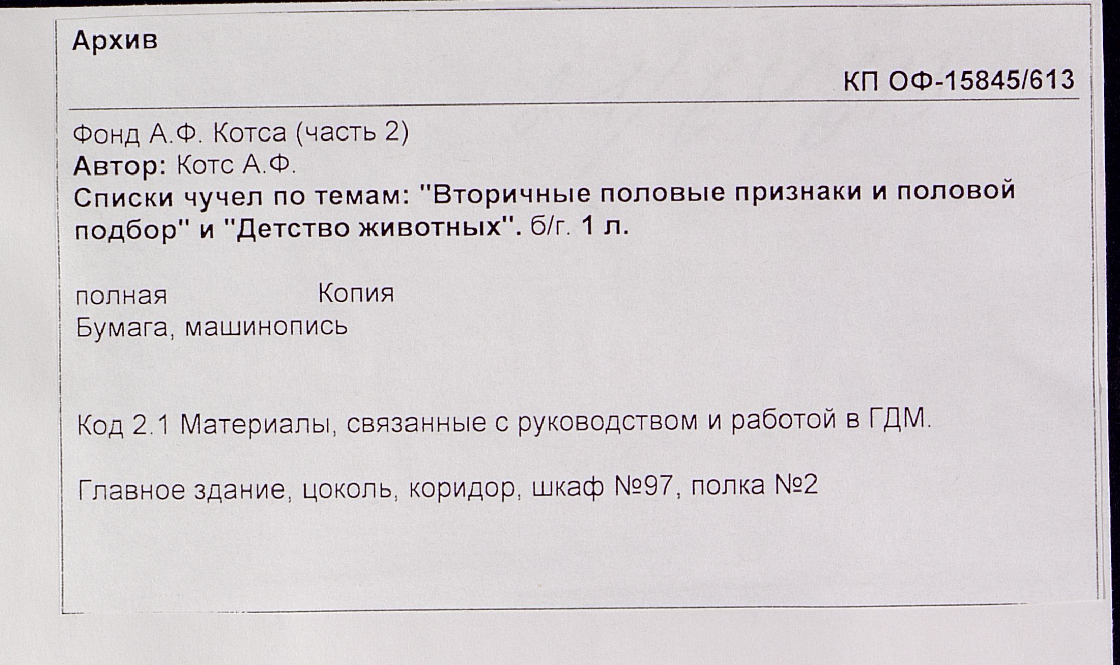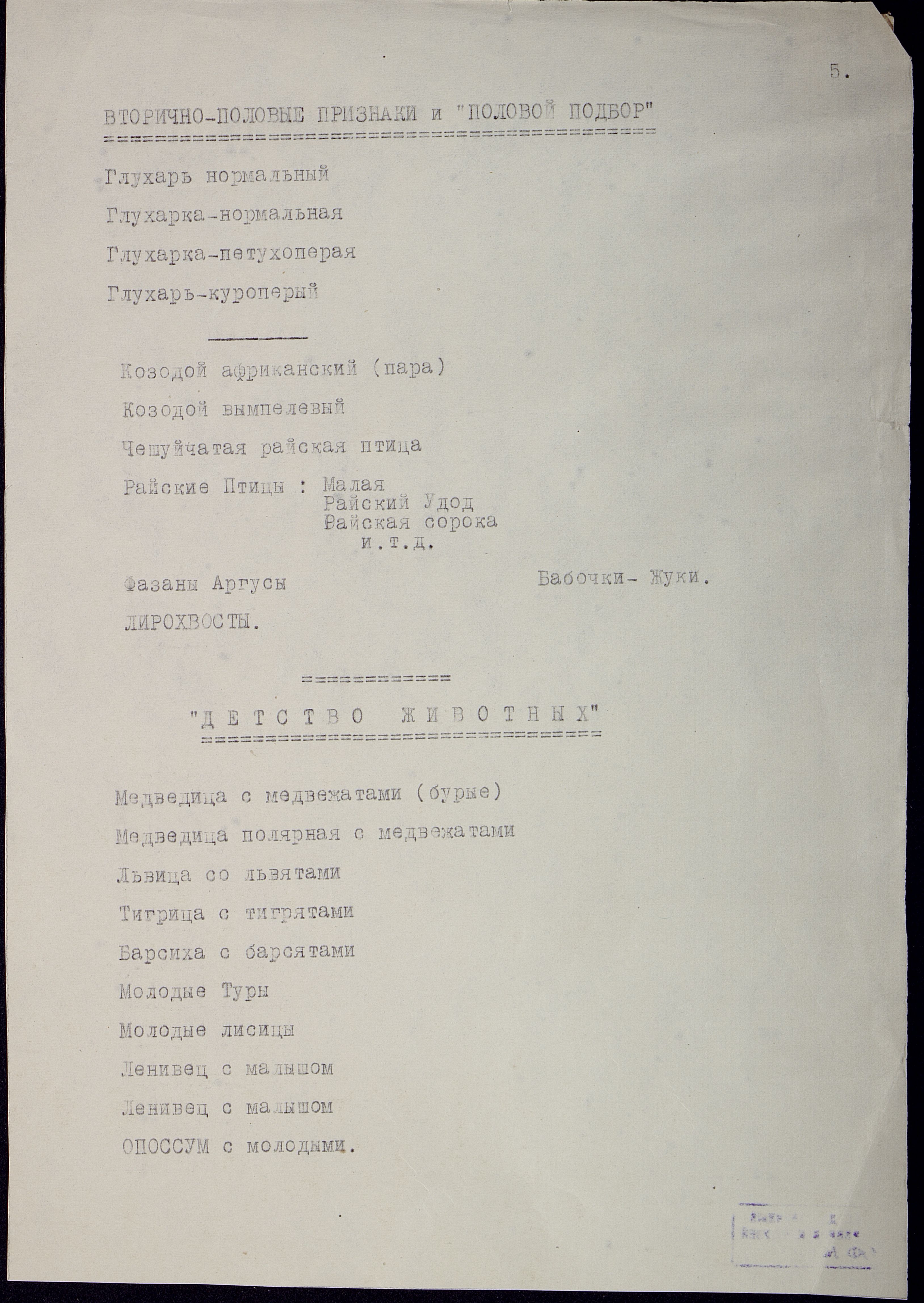 Списки чучел по темам: "Вторичные половые признаки и половой подбор" и "Детство животных"