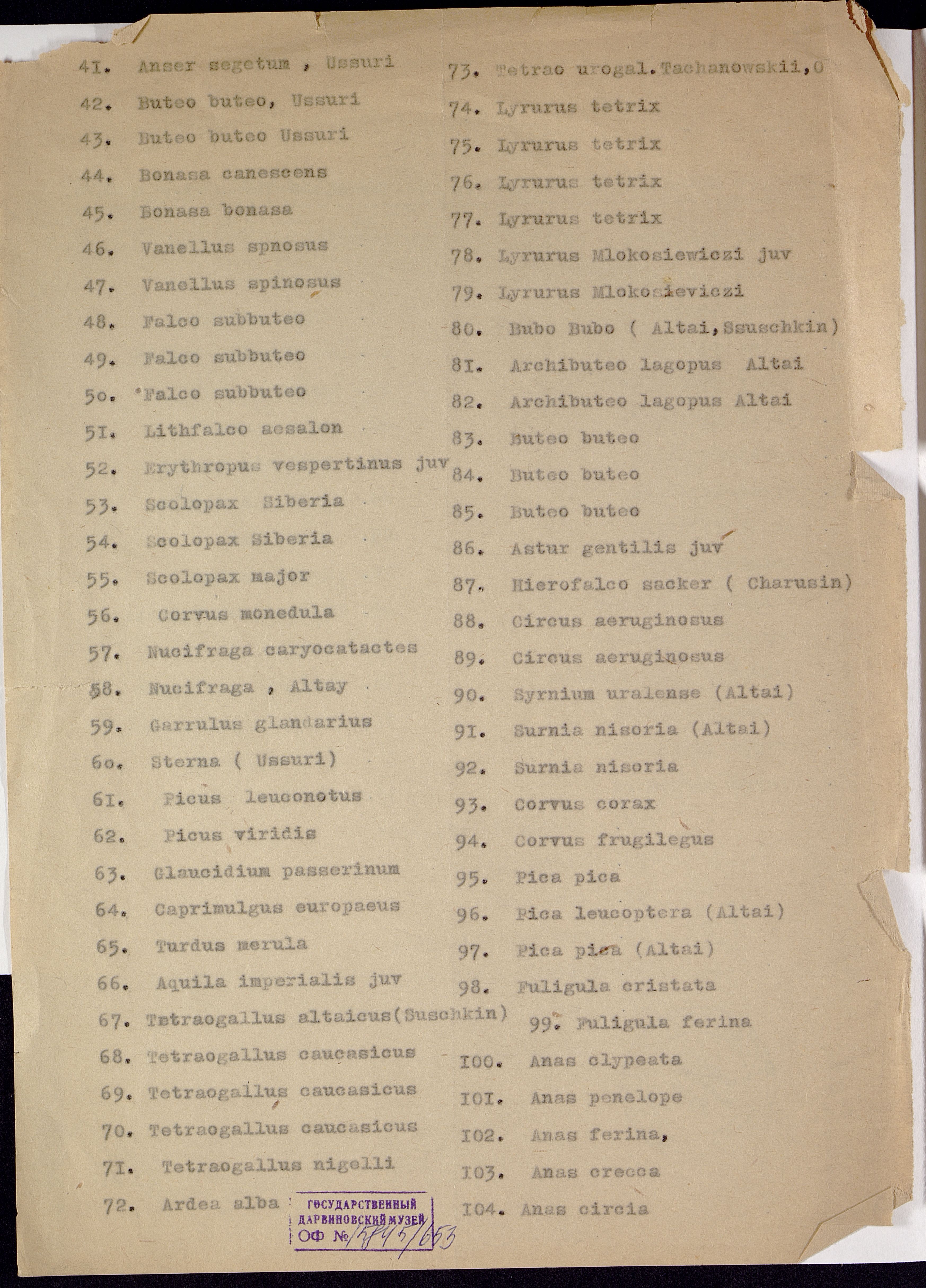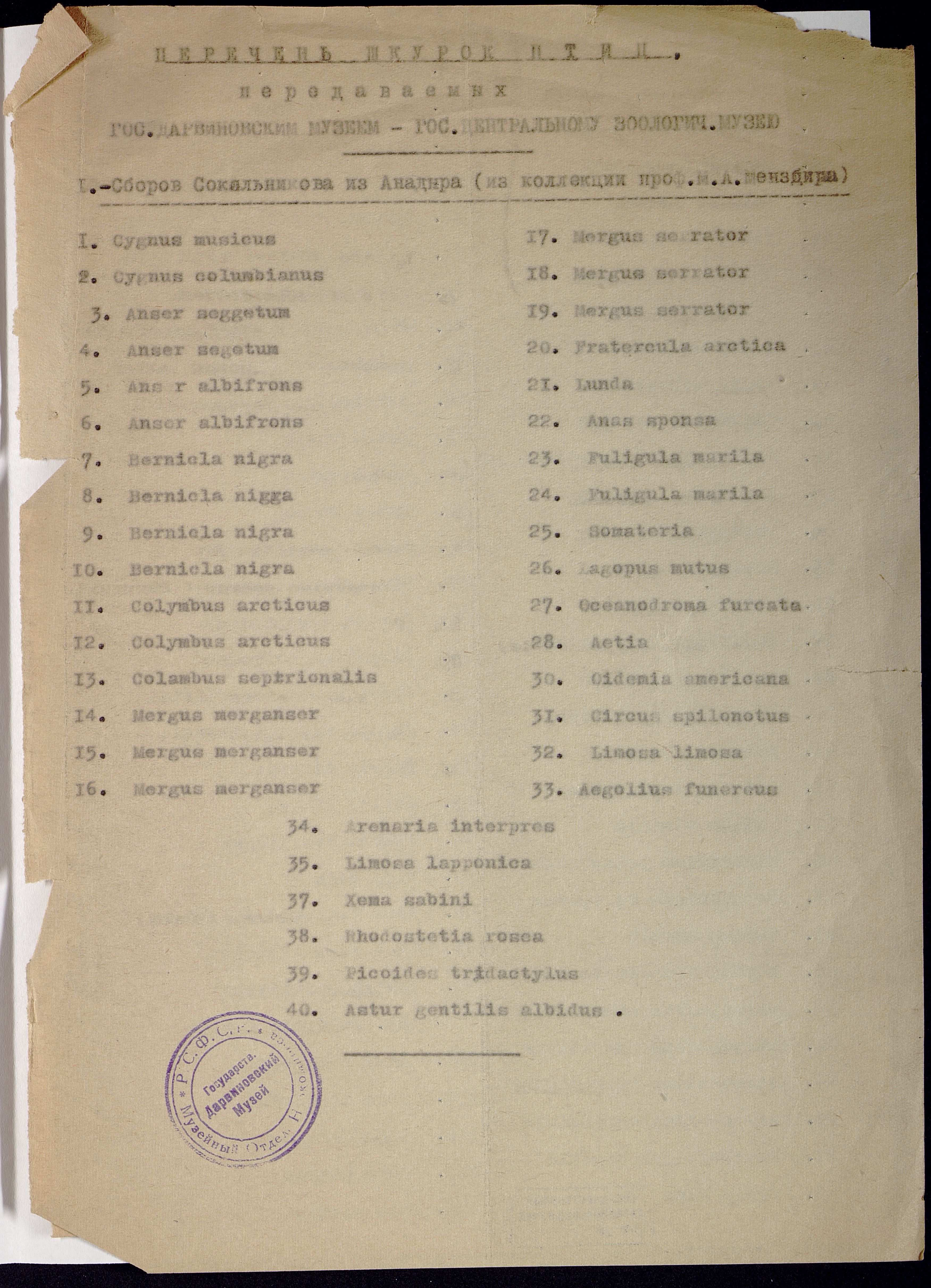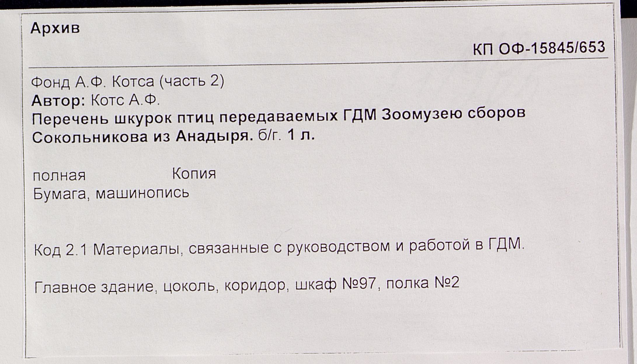 ОФ-15845/653 Перечень шкурок птиц передаваемых ГДМ Зоомузею сборов Сокольникова из Анадыря. Способ воспроизведения: машинопись.