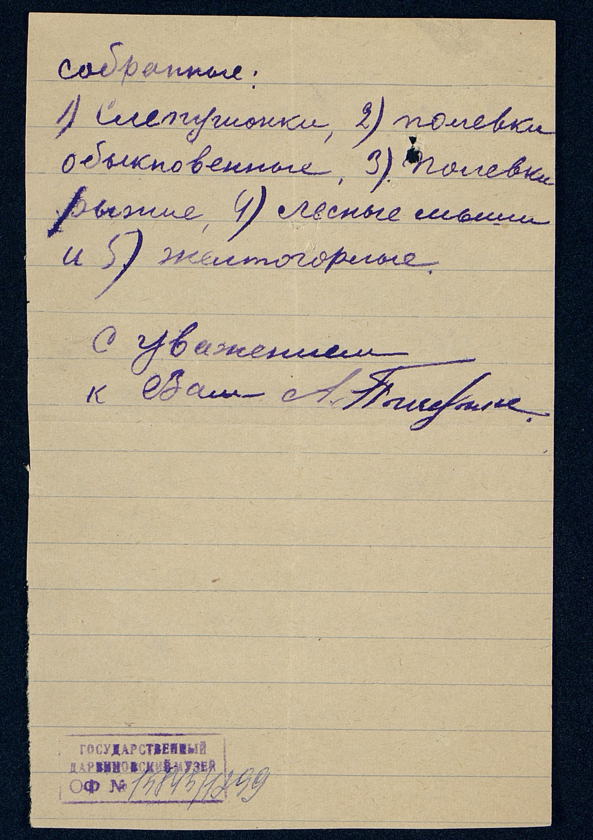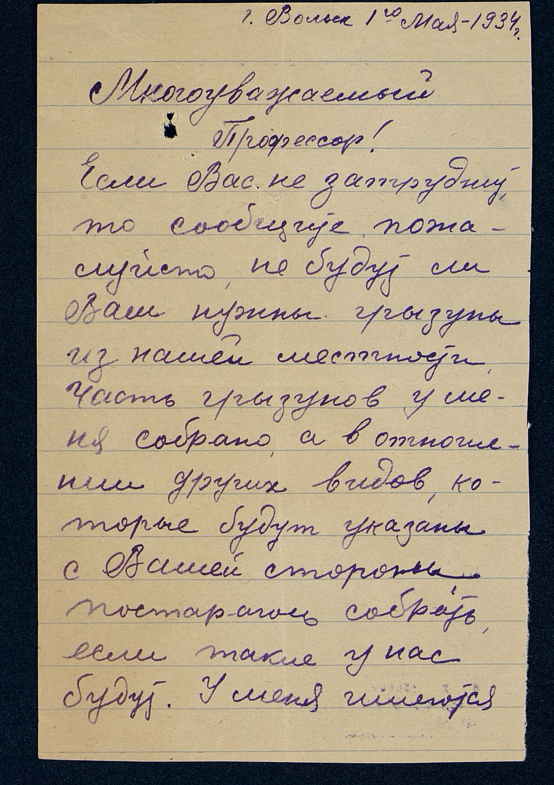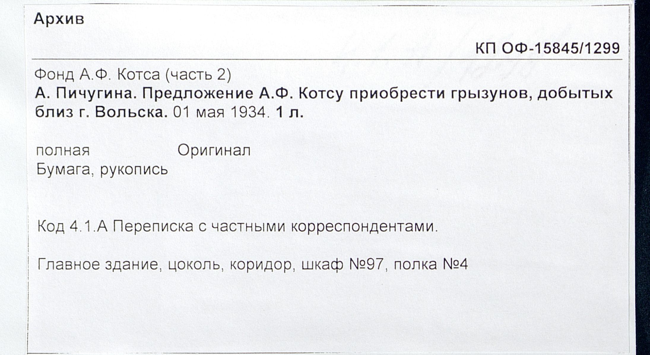 А. Пичугина. Предложение А.Ф. Котсу приобрести грызунов, добытых близ г. Вольска