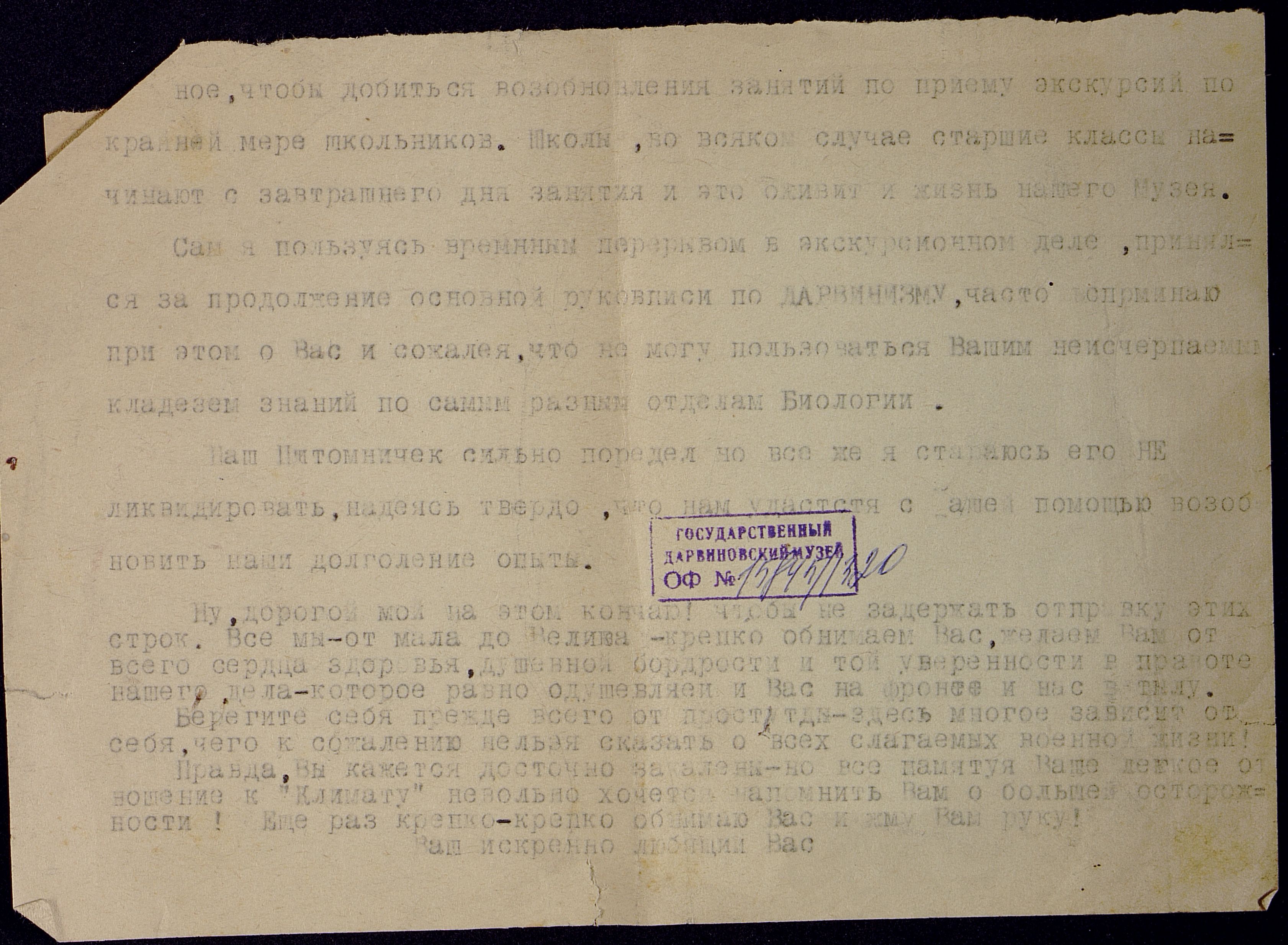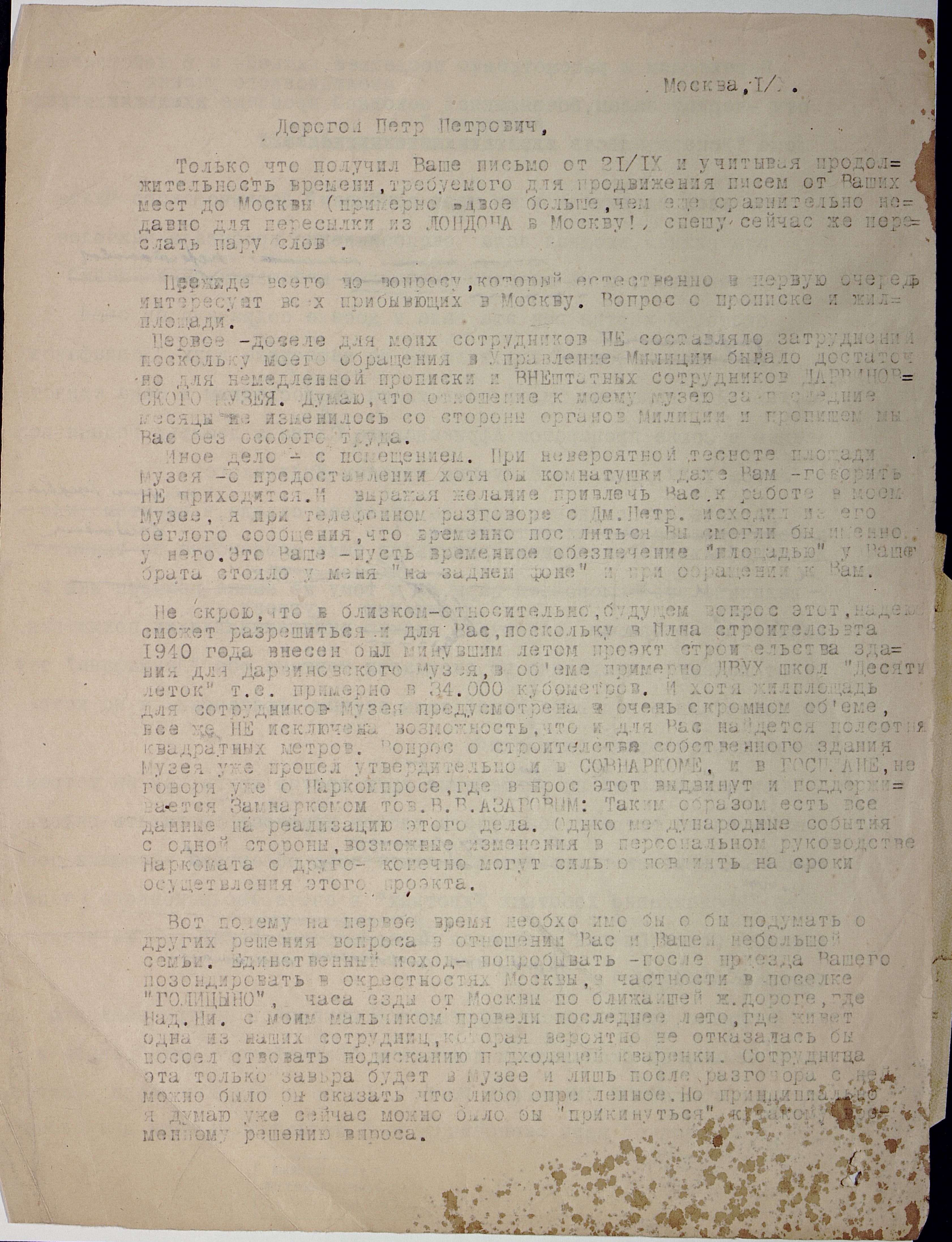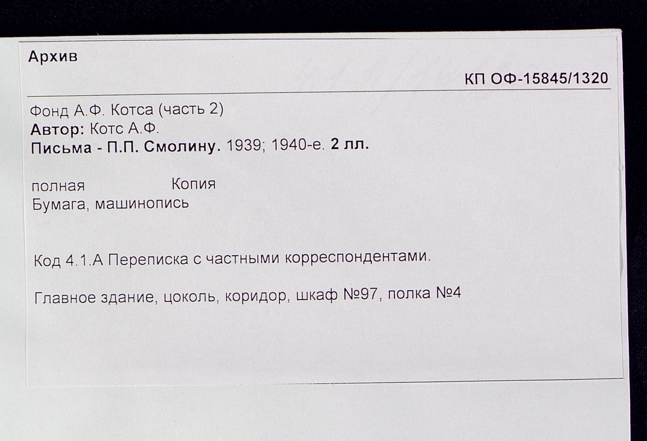 ОФ-15845/1320 Письма - П.П. Смолину. Время создания: 1939; 1940-е. Способ воспроизведения: машинопись.