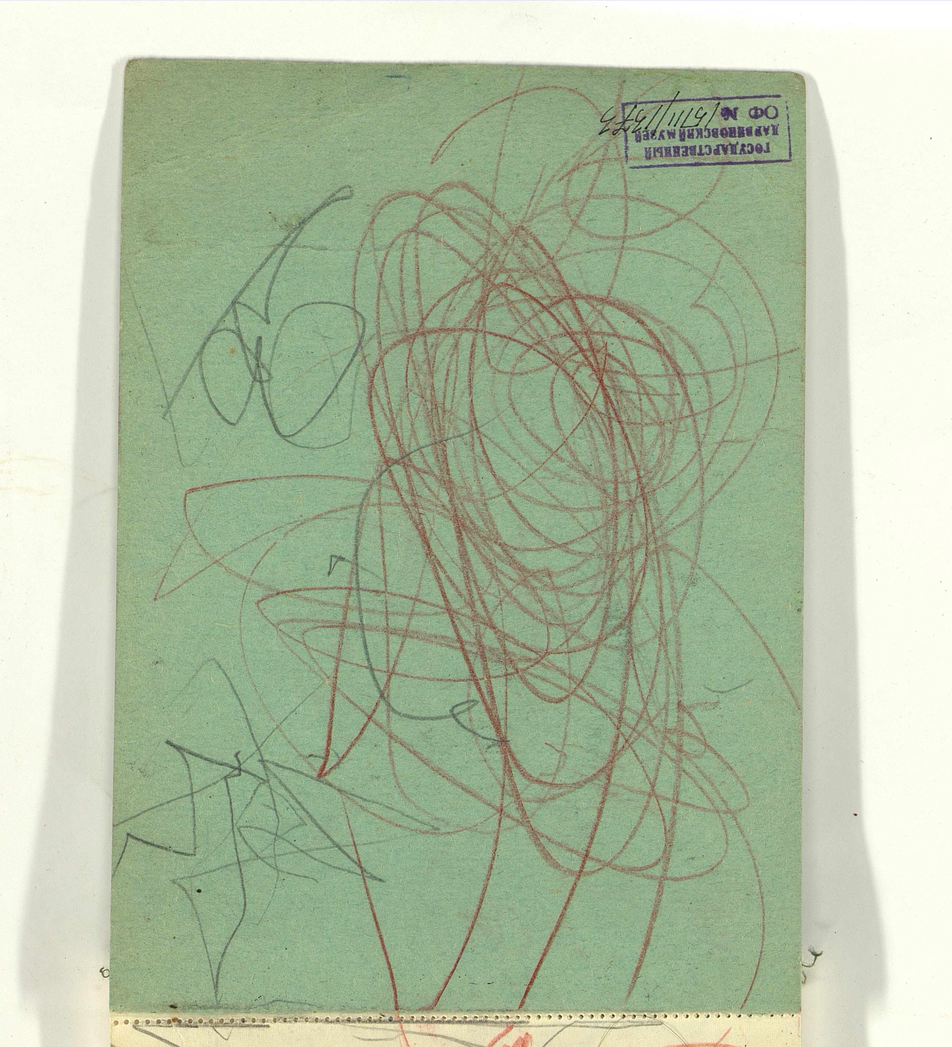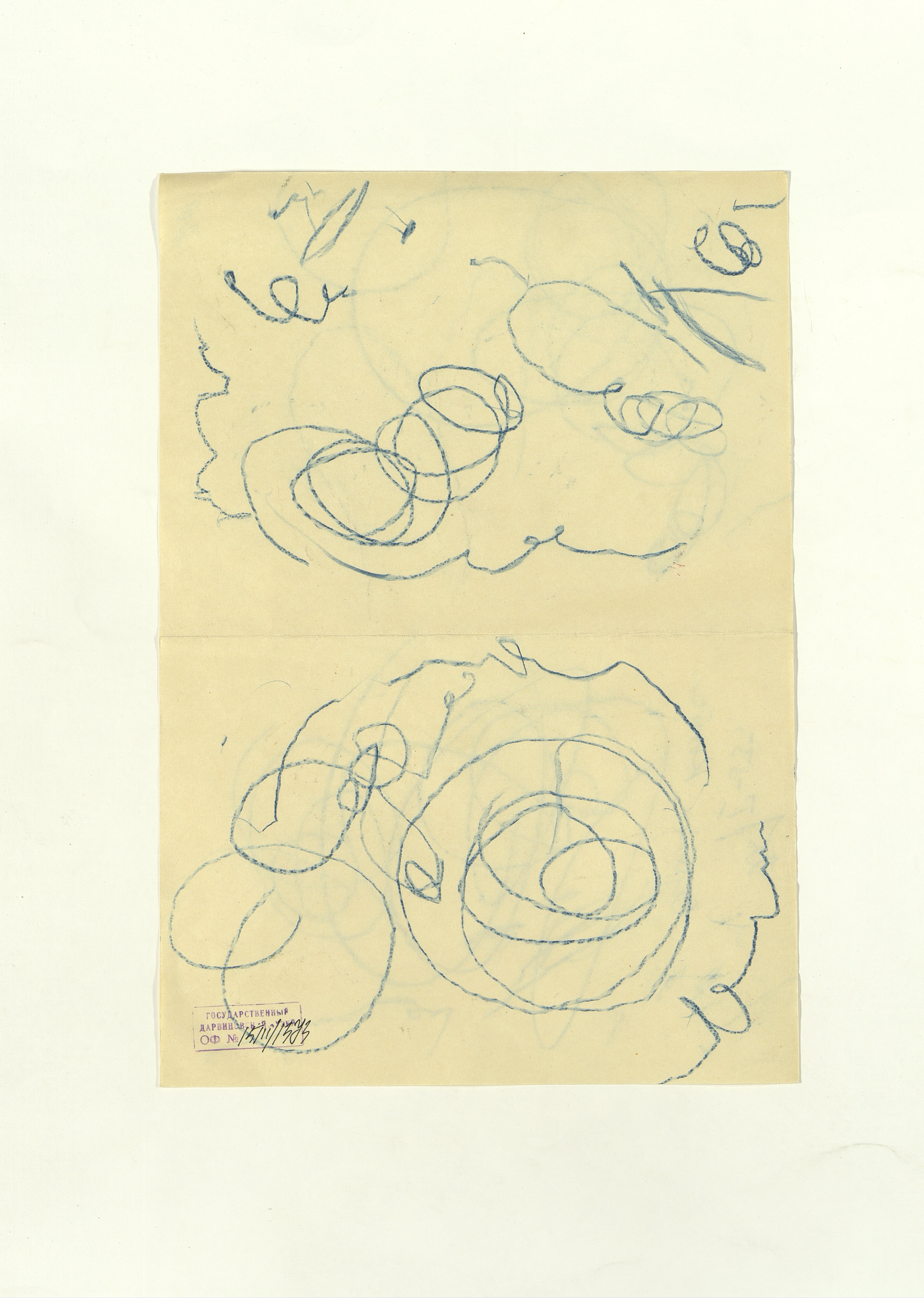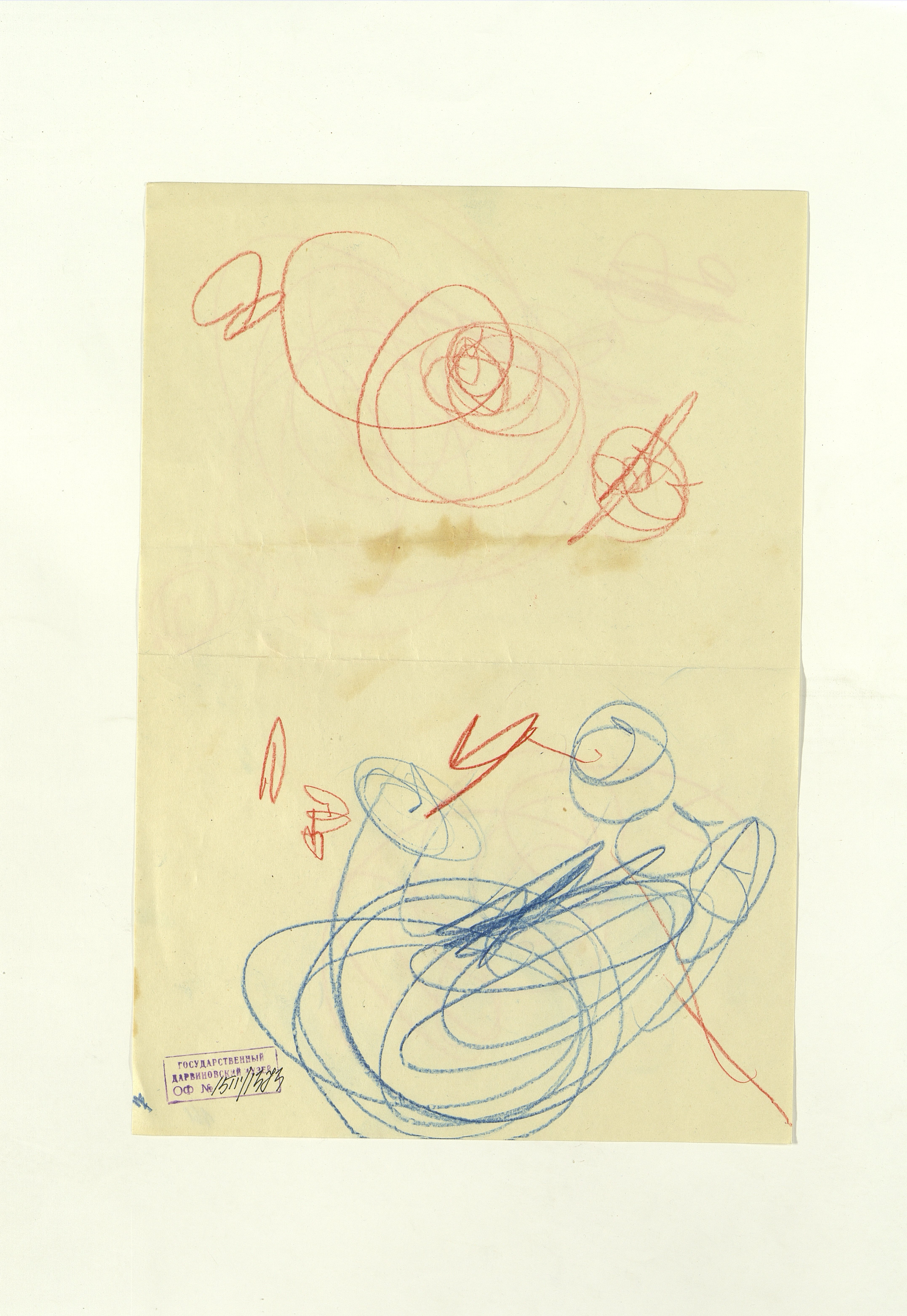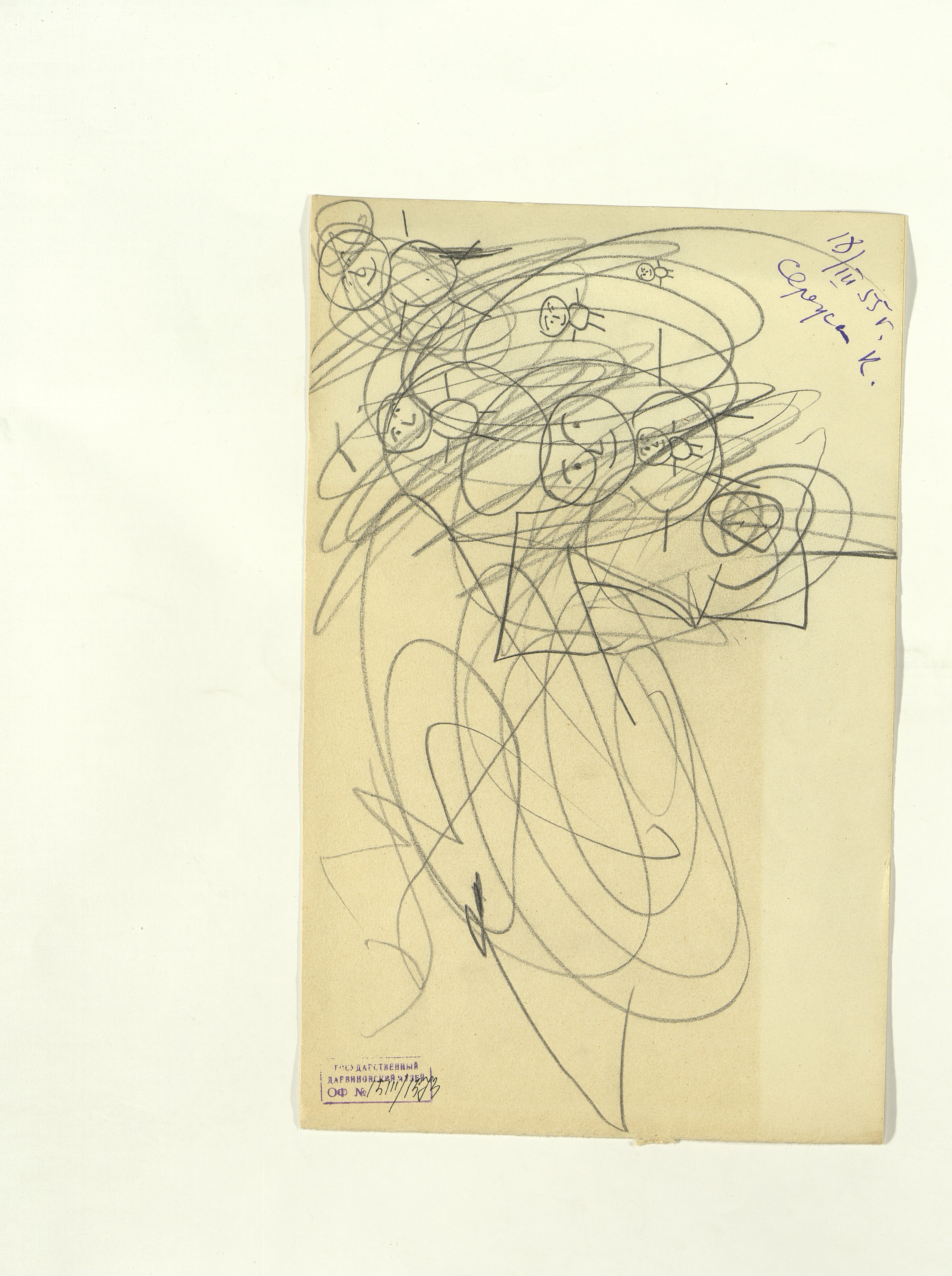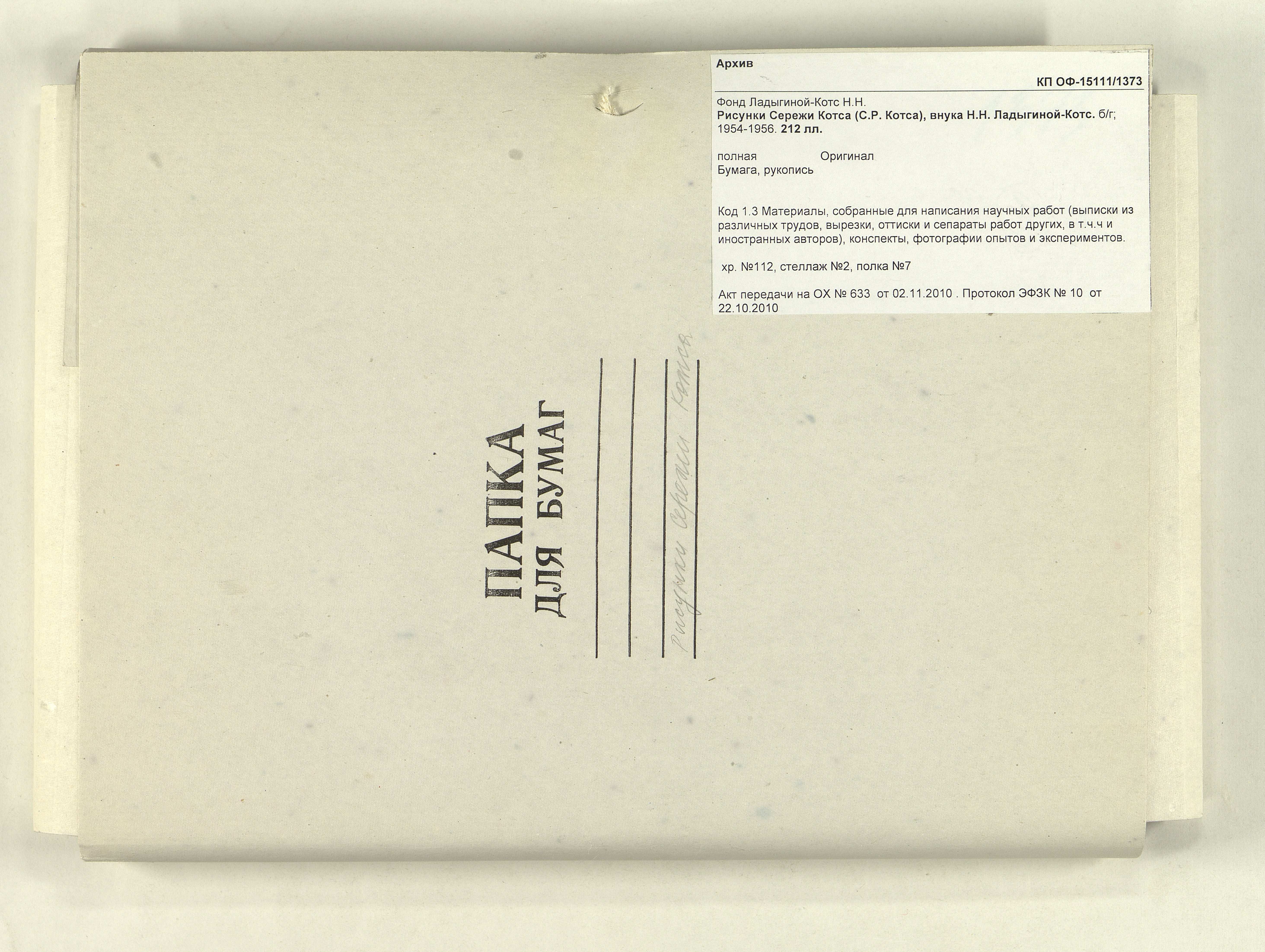 ОФ-15111/1373 Рисунки Сережи Котса (С.Р. Котса), внука Н.Н. Ладыгиной-Котс.. 2 блокнота; отдельные листы. Время создания: б/г; 1954-1956. Полнота: полная. Подлинность: оригинал. Способ воспроизведения: рукопись, бумага. Хранение: хр. №112, стеллаж №2, полка №7. Примечания: 212 лл., из старых поступлений, Без видимых повреждений, г. Москва